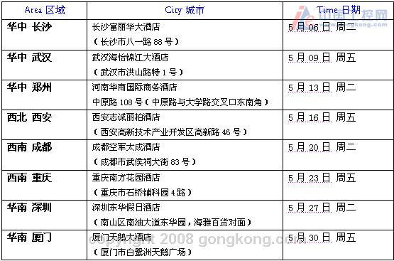 場次安排: 青島|煙臺|濟南|天津|北京|沈陽|長沙|武漢|鄭州|西安|成都|深圳|廈門 起止時間: 2008-04-09 至 2008-05-31