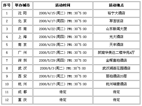 場次安排: 沈陽 2008.4.15|北京 2008.4.17|濟南 2008.4.22|上海 2008.4.24|南京 2008.4.29|廣州 2008.5.27|深圳 2008.5.29|武漢 2008.6.3|西安 2008.6.11|杭州 2008.6.17|成都 待定|重慶 待定| 起止時間: 2008-03-31 至 2008-06-17