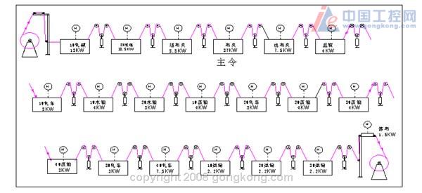 例1、東莞鵬鷗實(shí)業(yè)公司改造的LHM--142高速絲光機(jī),整機(jī)傳動(dòng)流程為:1#軋堿——2#軋堿——進(jìn)布軋車——布夾——出布軋車——直輥——1#軋車——1#水箱——2#水箱——1#蒸箱——2#軋車——2#蒸箱——3#蒸箱——4#蒸箱——3#軋車——4#軋車——三柱烘筒——落布,共20個(gè)傳動(dòng)單元。