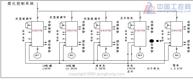 原電氣控制每一個(gè)傳動(dòng)單元為單獨(dú)的直流電源調(diào)速控制,電路復(fù)雜,調(diào)式、維修、操作比較麻煩。比如縮水率系統(tǒng)就有好幾個(gè)儀器才能完成。經(jīng)常出現(xiàn)故障,使用英威騰CHV170變頻器進(jìn)行改造后,復(fù)雜的電氣控制變得簡(jiǎn)單化,所有電氣控制直接由變頻器完成。操作簡(jiǎn)單方便、故障率大大降低,充分提高生產(chǎn)效率。