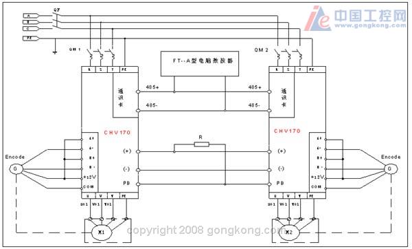 卷染機(jī)是一個(gè)典型的中心卷曲控制系統(tǒng),系統(tǒng)使用英威騰CHV170變頻器和FT-A型電腦數(shù)控器,配置通訊卡、PG測(cè)速反饋卡。