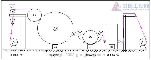 例2、江蘇無(wú)錫聯(lián)昌印染廠的卷染機(jī)采用雙電機(jī)(放卷+收卷)進(jìn)行對(duì)布匹染色加工的控制方案。