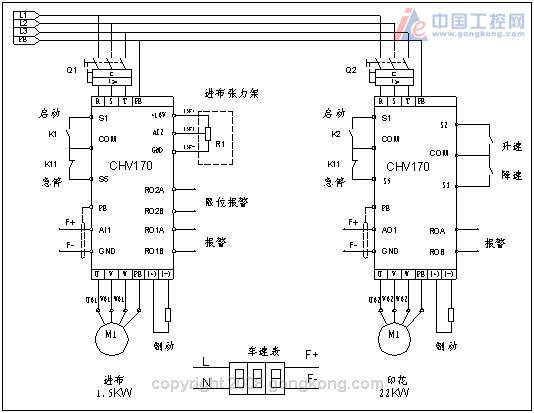 使用英威騰的CHV170系列張力控制型變頻器,可以省去松緊架上的限位開(kāi)關(guān),從而減少一個(gè)故障環(huán)節(jié)。不用同步控制器、不用DA或AD模塊,不用電腦主令給定板,又減小了一個(gè)故障環(huán)節(jié)。既省材料又省力氣。