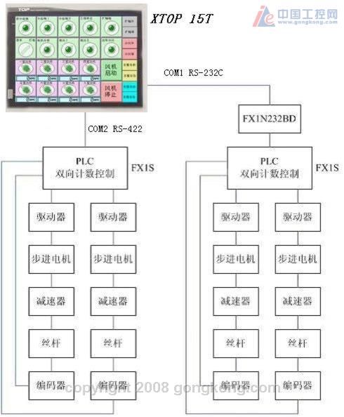 其中,觸摸屏需要和2個PLC通訊,為此使用了M2I公司的雙通訊協議,XTOP15T的COM2口使用RS-422直接與一個三菱公司的FX1S PLC通訊,另一個PLC通過FX1N-232BD通訊模塊將RS-422轉換為RS-232C的后再與XTOP 15T的COM1口相連,觸摸屏編程時在軟件上選擇雙通訊功能即可。作為控制單元的可編程控制器選用三菱FX1S PLC兩臺,控制系統中還包括通訊模塊FX1N-232BD一個,步進電機及其驅動器四套,旋轉編碼器四個等。