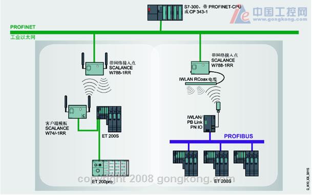 用來安裝在移動的堆垛機上將移動的控制器接入到無線接入點覆蓋的無線網(wǎng)絡中,達到移動設備通訊聯(lián)網(wǎng)的目的。SCALANCE W系列客戶端有兩種,一種是將以太網(wǎng)接口的控制設備接入到無線以太網(wǎng)的模塊,即 W 740系列產(chǎn)品;另一種是將標準的PROFIBUS DP從站設備接入到無線以太網(wǎng)的模塊,即IWLAN/PB LINK PN IO , 這個模塊本身作為一個DP主站與DP從站以主從方式通訊,同時與上位系統(tǒng)以PROFINET IO方式通訊。