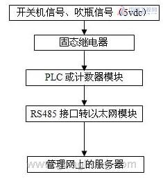 為了充分利用現有的軟、硬件資源,使設計方案具有可行性和良好性能價格比,我們對與本項目相關車間生產線的控制系統及數據服務接口情況進行初步調研,各生產線情況是:貼標簽生產線由于采用整套的控制系統,和生產廠家進行聯系后得知這種控制系統在出廠時沒有預留通訊接口。我們不能從生產線控制器中把貼標簽和吹瓶信號采集出來。我們只能從控制系統中把相關的數字輸出信號引出到PLC或計數器模塊上進行計數,但他們之間需加上固態繼電器進行隔離,這樣做是為了使新加的硬件系統不影響原來的控制系統。PLC或計數器模塊得到計數值后會通過以太網轉換模塊把相關數據傳給管理網的服務器上,這樣就完成了信號的初步采集。如下圖所示