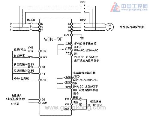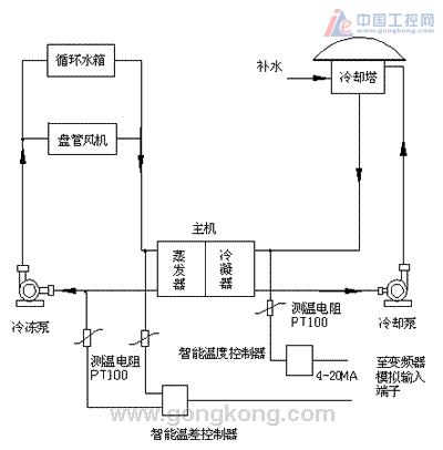 由上述原理可知,降低水泵的轉速,水泵的輸出功率就可以下降更多。改造前我們需要判斷系統是否具有節能潛力。由于中央空調系統所具有的特殊性,主要從兩個方面來考慮:首先是泵本身的額定流量與揚程指標和運行時實際輸出表現;其次是系統對實際供水需求量所要求的溫度差,或壓力與機組標準指標之間的偏差大小。以冷凍泵為例,采用實時采集進出水溫度數據,通過智能溫度控制器控制運算處理,輸出4-20MA的模擬信號,決定變頻器對泵的調節方向與調節幅度。為了避免出現“悶泵”或“斷流”現象,泵的轉速應限定在一定值以上,這個下限轉速(最低供給揚程和流量)可以通過變頻器的輸出下限頻率來設定,在保證足夠的揚程和流量的前提下(避免中央空調系統低壓檢測報警動作),建議采用溫度控制方式來實現。