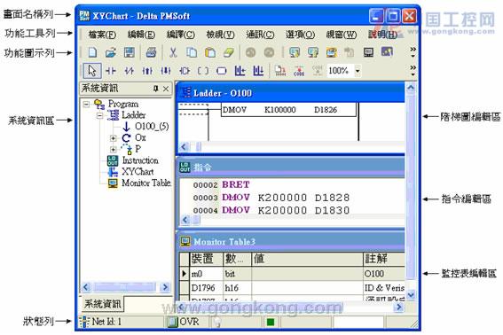為方便切換階梯窗口,只要點選系統信息列中的樹枝狀對應的程序編號,自動切換對應的程序編輯窗口,在PMSoft編輯環境中同時只能有一個階梯圖窗口,這是為了在龐大復雜程序中找尋程序方便,同時將主程序、運動子程序、一般子程序這三種程序模塊化處理,O100主程序只有一個編輯窗口,Oxn運動程序有100個編輯窗口,Pm子程序有256個編輯窗口,總共有357個窗口,每個窗口未編輯都有10 network。程序編輯由網絡區段組成,每個網絡區段是由輸入與輸出編輯區域所組成,在編輯過程中,自動產生邏輯結構正確的階梯圖,使用者無須再做額外補線的動作,網絡區段編輯并具有錯誤提示功能。