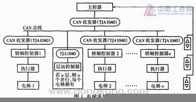 摘要: 基于C167CS 微控制器設(shè)計(jì)了數(shù)字化電梯系統(tǒng), 該系統(tǒng)中利用多規(guī)則加權(quán)的模糊控制算法進(jìn)行群控控制,以CAN總線多主方式實(shí)現(xiàn)各控制器間的串行通信。該系統(tǒng)提高了電梯的運(yùn)行效率,并增強(qiáng)了電梯運(yùn)行的實(shí)時(shí)性控制,系統(tǒng)的靈活性與可靠性得到了提高。 關(guān)鍵詞: 數(shù)字化電梯; C167CS; 模糊控制; CAN總線 1 引言 國(guó)民經(jīng)濟(jì)的飛速發(fā)展, 現(xiàn)代化程度日益提高,高層建筑愈來(lái)愈多, 電梯也隨之增多, 電梯產(chǎn)品在人們物質(zhì)文化生活中的地位得到了提高,成為重要的運(yùn)輸設(shè)備之一。國(guó)內(nèi)傳統(tǒng)的電梯控制一是由繼電器、接觸器構(gòu)成。它不僅存在著可靠性差、成本高、故障率高等缺點(diǎn),而且在層數(shù)增加時(shí),配線變化給制造及安裝帶來(lái)諸多不變。若用微機(jī)來(lái)控制電梯具有許多優(yōu)點(diǎn),進(jìn)而數(shù)字化電梯控制系統(tǒng)是發(fā)展的必然。數(shù)字化最大的優(yōu)點(diǎn)之一是在信號(hào)的傳輸方面, 而且同時(shí)也將交換的功能聯(lián)系在一起, 視頻信號(hào)、音頻信號(hào)、計(jì)算機(jī)數(shù)據(jù)都利用0、1 二進(jìn)制代碼在同一網(wǎng)絡(luò)里傳輸和交換,這種以數(shù)字化為共同語(yǔ)言彼此相容和溝通的特性,使各種形式的信息傳輸速度大大加快,使得整個(gè)系統(tǒng)更加有效。本文旨在開(kāi)發(fā)數(shù)字化電梯系統(tǒng)。 2 系統(tǒng)的總體結(jié)構(gòu) 本系統(tǒng)中,以C167CS微控制器為基礎(chǔ),開(kāi)發(fā)了數(shù)字化電梯系統(tǒng)。整個(gè)系統(tǒng)的結(jié)構(gòu)如圖1所示。它主要包括主控器、轎廂控制器、層站控制器、通訊模塊及廳外呼叫部分。