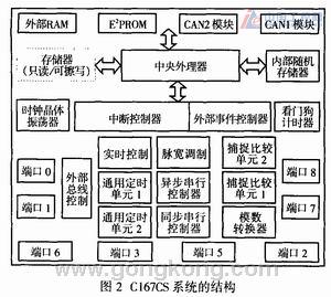 主控器:是指控制相應(yīng)電梯運(yùn)行的控制器。它負(fù)責(zé)與各轎廂控制器、層站控制器相互通訊, 并發(fā)送控制指令來(lái)控制相應(yīng)電梯的運(yùn)行。通過(guò)采集到的各個(gè)電梯的狀態(tài)及廳外呼叫來(lái)決定指派最優(yōu)的電梯來(lái)進(jìn)行工作。主控器控制變頻器進(jìn)行調(diào)速控制; 接收旋轉(zhuǎn)編碼器的輸出的脈沖信號(hào), 作為速度反饋信號(hào); 具有RS-232接口, 以與其它設(shè)備相聯(lián)接,以進(jìn)行電梯的監(jiān)控與調(diào)試。 轎廂控制器: 它控制單個(gè)電梯的運(yùn)行, 并將電梯的運(yùn)行狀態(tài)及時(shí)傳送到主控器,以便主控器發(fā)送指令來(lái)控制整個(gè)系統(tǒng)的運(yùn)行。 層站控制器: 采集樓層召喚信號(hào), 控制按鈕燈的輸出,并以滾動(dòng)方式顯示方向和樓層。基站的樓層控制器增設(shè)鑰匙開(kāi)關(guān)、消防運(yùn)行開(kāi)關(guān)輸入功能,以實(shí)現(xiàn)電梯的開(kāi)/ 停和消防運(yùn)行,并通過(guò)CAN端口與總線相連接。 通訊模塊: 采用CAN總線多主結(jié)構(gòu),來(lái)實(shí)現(xiàn)電梯主控器、層站控制器、外呼和轎廂之間控制信號(hào)的串行通信。 廳外呼叫及顯示:在電梯的每層廳外都有呼叫選擇部分, 它代表乘客的乘梯方向(如向上或向下) ,并給予相應(yīng)的LED 顯示。 系統(tǒng)工作原理: 各個(gè)轎廂控制器及層站控制器將采集到的信號(hào)發(fā)送到CAN總線, 主控器根據(jù)這些信號(hào)及相應(yīng)的群控算法選擇最優(yōu)的電梯進(jìn)行響應(yīng),結(jié)合專(zhuān)用線路上的安全信號(hào)、旋轉(zhuǎn)編碼器脈沖信號(hào)等發(fā)出選層、定向、變速和平層等指令, 控制轎廂的運(yùn)行及門(mén)機(jī)的動(dòng)作, 并將轎廂的位置信號(hào)發(fā)送到CAN總線上。顯示模塊則相應(yīng)地進(jìn)行LED顯示。在數(shù)字化電梯系統(tǒng)的設(shè)計(jì)中關(guān)鍵部分是主控器中的群控算法及CAN總線通信的實(shí)現(xiàn), 下面詳細(xì)介紹此兩部分的具體實(shí)現(xiàn)。 3 C167微控制器介紹 C167 單片機(jī)是80C166 系列中的一款高性能的微處理器。CPU時(shí)鐘頻率最高可達(dá)40MHz , 片內(nèi)ROM128K/256 K,片內(nèi)RAM11K,尋址能力16M。采用4 級(jí)流水線,有56個(gè)中斷(16個(gè)優(yōu)先級(jí)) ,外設(shè)事件控制器PEC ,32 通道比較/ 捕捉單元,2 個(gè)通用定時(shí)器單元, 以及4 通道的PMW。多通道10位的A/D轉(zhuǎn)換口,C167的I/O 接口多達(dá)111個(gè),其串行I/ O接口有同步/異步接口UART、高速同步接口SSC。同時(shí)擁有CAN總線通信控制器模塊, 可以支持高速串行通信協(xié)議CAN2.0B , 即支持標(biāo)準(zhǔn)(11位ID) 和擴(kuò)展(29位ID) 的通信協(xié)議。可編程外部總線可對(duì)不同地址范圍進(jìn)行不同的設(shè)置。 C167 單片機(jī)的集成度高、功能多、性能強(qiáng)。C167單片機(jī)的品種也比較多, 比如C167S、C167CR、C167CS等,這些單片機(jī)的I/O基本功能是相同的, 都是111根引腳, 只是片內(nèi)RAM以及ROM大小有所不同。本文采用的單片機(jī)型號(hào)是C167CS, 圖2 所示為C167CS的結(jié)構(gòu)圖。