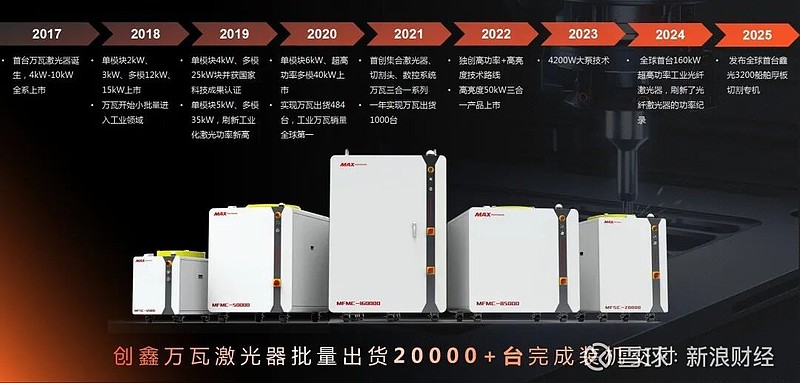 基于上述一系列從內到外的突破,創鑫激光成功打通整個萬瓦賽道,為行業指明發展路徑。多家企業迅速跟進,推動高功率光纖激光技術加速滲透工業領域,帶動產業鏈進入高速增長階段,激光行業隨之迎來為期3-5年的黃金發展期,極大促進了中國激光產業鏈的整體升級。下游設備企業普遍將萬瓦級激光切割設備作為業務核心,國產超高功率激光設備實現集體性突破與爆發式增長。