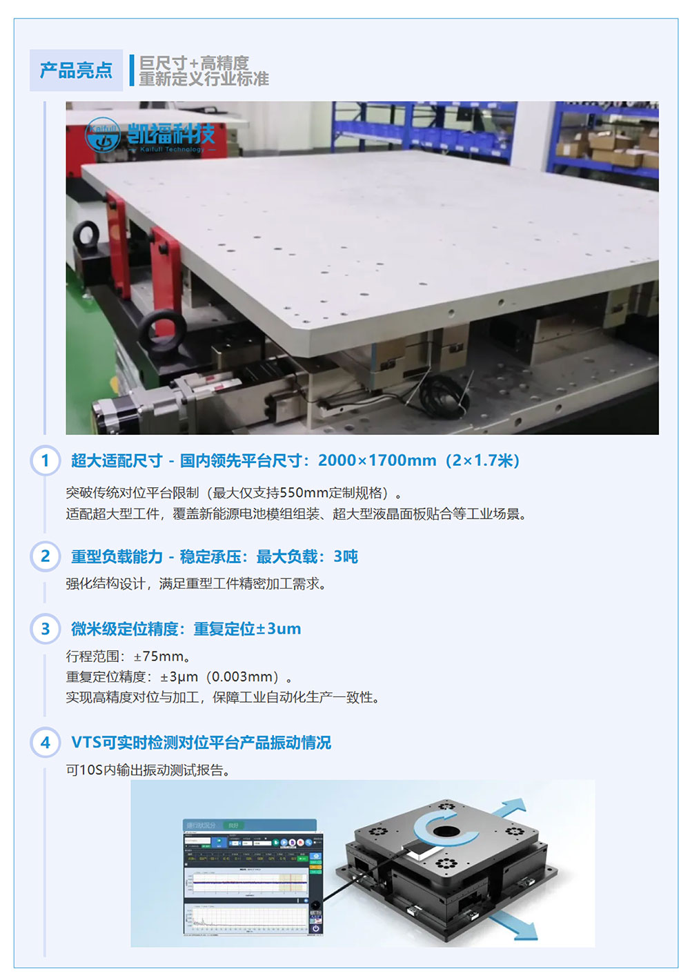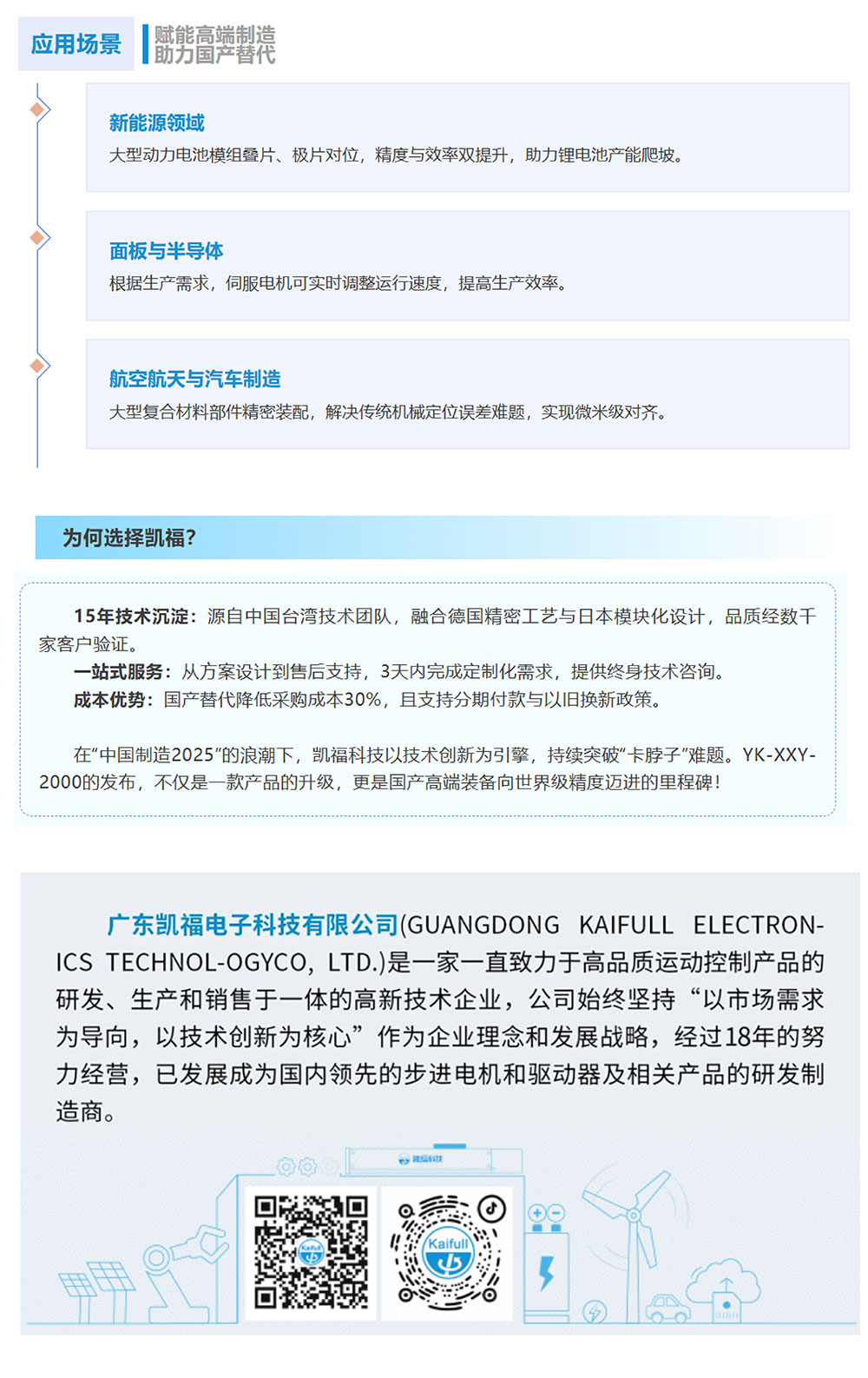 在高端制造領(lǐng)域,對位精度是決定產(chǎn)品良率的核心要素之一。凱福科技作為國內(nèi)運動控制領(lǐng)域的領(lǐng)航者,正式發(fā)布全新一代超大型對位平臺——YK-XXY-2000,尺寸達(dá)2×1.7米,定位精度突破3μm!這一產(chǎn)品填補了國產(chǎn)大尺寸高精度對位平臺的空白,為新能源、半導(dǎo)體、航空航天等產(chǎn)業(yè)提供了更高效的國產(chǎn)化解決方案。