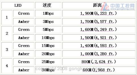 前面板上8種速率指示LED:最大速率30Mbps @ 600米 (1,968英尺), 最低速率1Mbps @ 1,900米 (6,233英尺.)
