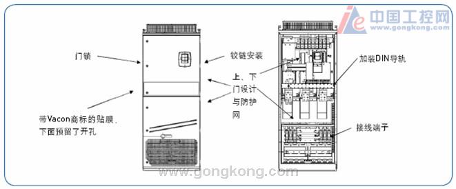 • 柜門(mén)上預(yù)留開(kāi)孔,用于安裝用戶需要的指示燈與開(kāi)關(guān) (開(kāi)孔由一個(gè)有VACON標(biāo)識(shí)的貼膜覆蓋)