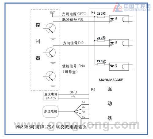 M420/MA335B是采用中國專利技術生產的高性能步進驅動器,適合驅動任何2.0A或3.5A相電流以下的兩相或四相混合式步進電機。此驅動器還具有其它許多理想特點,例如:單電源供電、光隔離輸入、細分精度可選等。步距角細分功能可使電機運轉平滑,振動減少,噪聲降低,精度提高。細分精度可由用戶輕易設定,最高可達128細分(25600步/圈)。另一有用的功能(可用撥碼開關啟用或取消)是靜止自動減流:當電機處于停止狀態時,輸出電流可自動降至較低值,從而減少電機和驅動器的發熱。驅動器側面裝有一排八位撥碼開關組,用戶可輕易設定動態工作電流(共8等級)、靜態減流和細分精度。