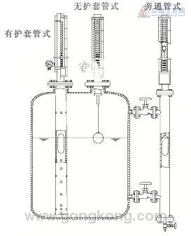 1、在容器從不適宜側面開孔及容器周圍空間很少時,可在容器上部或下部安排本形式的液位計。
