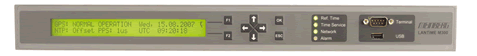 LANTIME M300/GPS是入門機型,適用于需要高度可靠、穩定性和精確網絡時間來源之應用場合。它擁有2個以太網絡接口,和一個帶有內建振蕩器的Meinberg GPS接收器。前方面板上有LCD液晶顯示板及8個操作按鍵,這樣的配置讓使用者便于設定基本網絡參數,例如IP地址、網關和網絡屏蔽。跟其它廠牌產品不同的是,液晶顯示板的菜單可供設定更多的額外細部參數,并可顯示其它詳細信息狀態,例如GPS狀態(可檢視/接收的衛星)或NTP相關狀態(目前所處層次、偏差信號和同步信號來源)。新增的3個雙色LED狀態指示燈,可透過不同的顏色顯示,提供網絡接口、參考時間(如GPS接收器)和網絡時間服務器(NTP)等狀態信息。面板上的另一個警報LED指示燈可以顯示這個裝置何時需要維護,并將目前不匹配的狀態導入LANTIME通報系統,這個通報系統透過電子郵件(SMTP)、 SNMP traps、Windows彈出訊息和系統記錄發出警報。針對那些工業界或實驗室的使用單位,M300可以透過BNC連接頭,提供高精度的10Mhz及PPS的信號輸出。